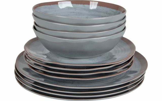 Lujosa vajilla de melamina de 12 piezas. Esta vajilla de melamina es prácticamente irrompible y pesa muy poco. Además, el juego es resistente a los arañazos y se puede lavar a máquina. Este elegante juego es adecuado para 4 personas y consta de 4 platos llanos, 4 platos pequeños y 4 cuencos.
