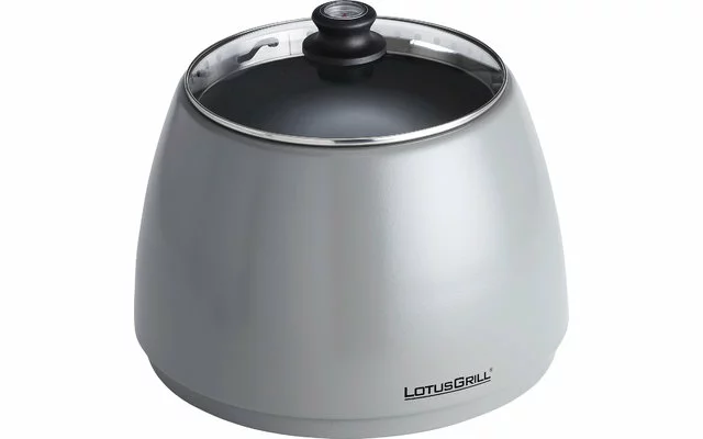 El capó de la parrilla, especialmente desarrollado, con inserción de vidrio de seguridad, transforma la LotusGrill en un verdadero multitalento. el termómetro integrado en el pomo facilita la lectura de la temperatura alcanzada en cualquier momento. El inserto de la mirilla puede utilizarse en dos posiciones y, en la posición elevada, proporciona aire de salida adicional a través de las rendijas de ventilación que quedan así abiertas. La regulación ideal del calor se consigue a través del control de la temperatura ajustable directamente en la LotusGrill.
