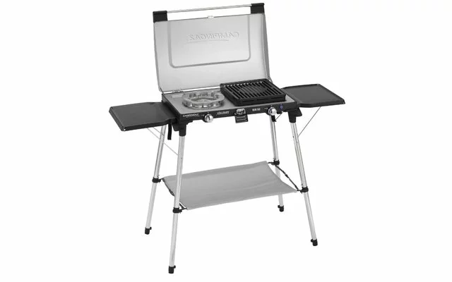 El compañero perfecto para acampar con un sinfín de opciones para cocinar. ¿Por qué no tomar un desayuno inglés con judías, salchichas y tostadas? ¿O qué tal un pescado fresco y una deliciosa pasta? Las cocinas con opciones de cocción multifuncionales le ofrecen una gran variedad en la preparación de sus comidas (cocina y parrilla con placa de parrilla de contacto).