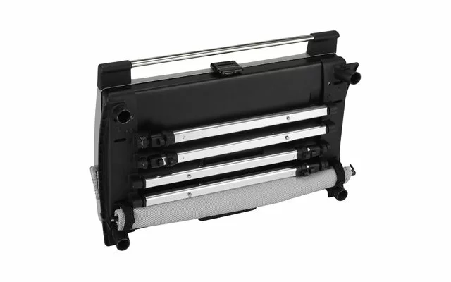 Con asa de transporte de fibra de vidrio reforzada y 2 lados de almacenamiento metálico y textil. Patas ajustables en altura con posibilidad de almacenamiento en la parte inferior de la caja. Dimensiones de transporte: 63 x 42 x 17 cm.