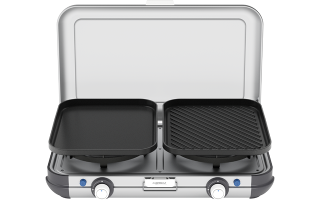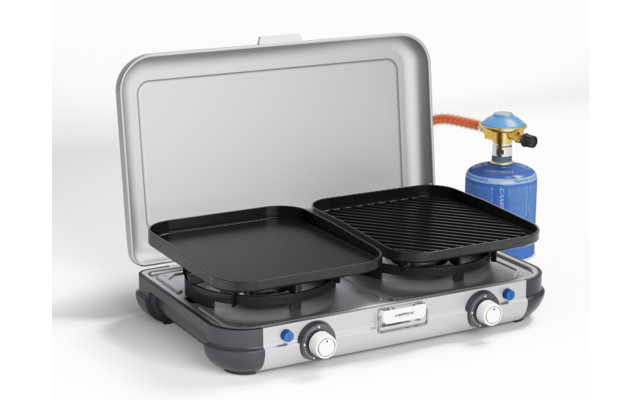 El hornillo de 2 fuegos con rejilla extraíble y placa plancha le ofrece la flexibilidad de cocinar o asar diferentes platos en cualquier momento.