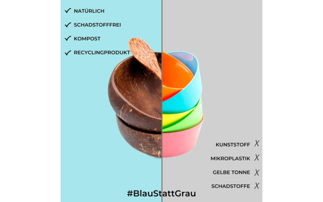 - Hecho a mano: Cada cuenco de coco se procesa, se limpia, se lija y se pule a mano: es único en forma, tamaño y grano. Las cucharas de madera se fabrican con el tronco del cocotero y los anillos se anudan con fibra de coco. No sólo son libres de plástico y reutilizables, sino también elegantes y prácticos.