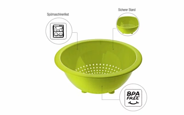 El colador Caruba tiene un diámetro de 24,5 cm. Está fabricado con un plástico robusto y fácil de limpiar, que naturalmente no contiene ninguna sustancia perjudicial para la salud o el medio ambiente, como el bisfenol A. Su forma sencilla y elegante y su fresco colorido también realzan el aspecto del colador. Este práctico artilugio de cocina es ligero y a la vez estable: sus tres patas garantizan un soporte seguro, incluso cuando el escurridor está lleno de objetos pesados. Gracias al amplio borde que lo rodea, tiene un agarre firme de todo, incluso con las manos mojadas. Después de su uso, puede limpiar simplemente el colador en el lavavajillas sin rayar ni deformar el plástico. Se pueden apilar varios dentro de otros cuando no se utilizan, lo que permite ahorrar espacio en el armario. Regálese un utensilio de cocina extremadamente duradero a un precio atractivo