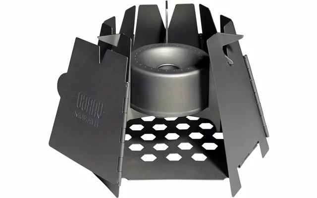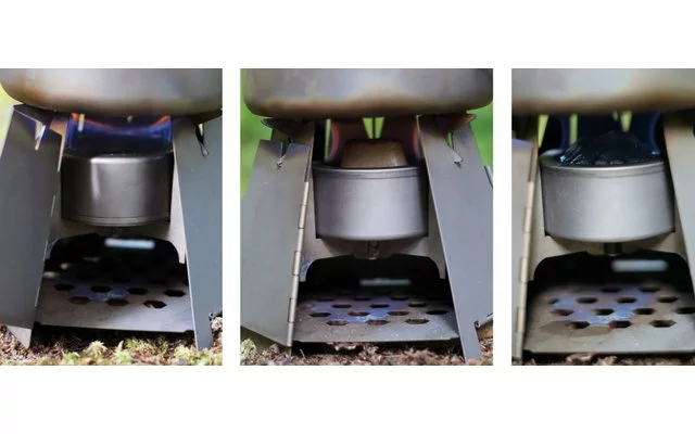 El convertidor se calienta muy rápidamente y no produce mucho hollín. Puede funcionar con alcohol, aguardiente, cubos de combustible o gel combustible. Para cambiar entre el combustible líquido y las pastillas / el gel, basta con dar la vuelta a la cocina en el soporte de tres patas. Los pies plegables permiten un embalaje compacto, una posición estable y también el uso del convertidor como cocina independiente.