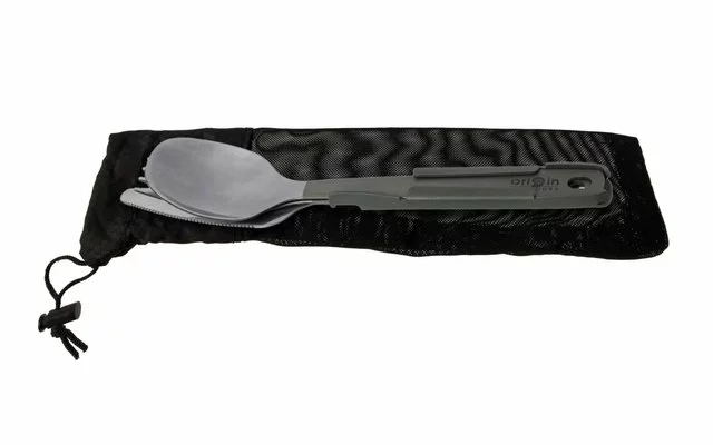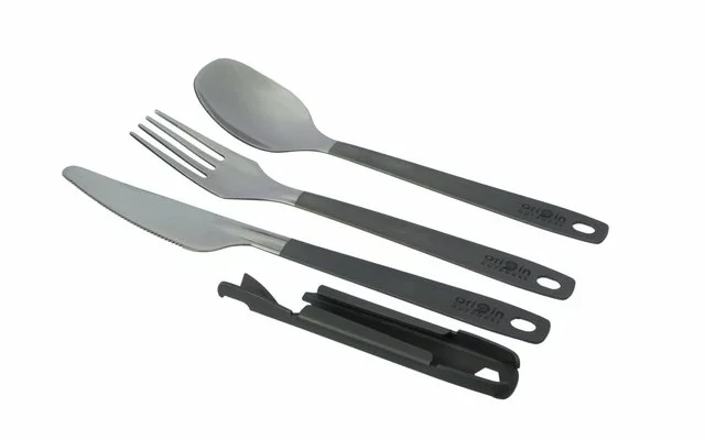 El cuchillo, el tenedor y la cuchara están muy pulidos. Además, el soporte contiene un abrelatas y un abrebotellas, así como una llave de estrella hexagonal de tamaño 7.