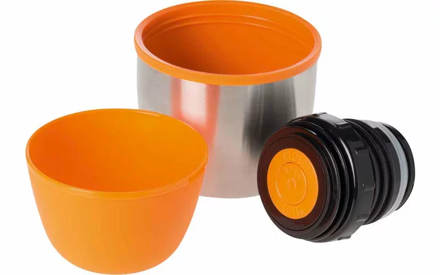 La botella aislada mantiene las bebidas calientes o frías durante un tiempo especialmente largo -tiene un tapón con función de vertido y un tapón de rosca adicional- y también se incluyen dos tazas para beber.