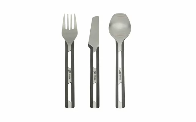 Este robusto y a la vez ultraligero juego de cubiertos sólo pesa 42 g y cumple todos estos requisitos. Fabricados en titanio, se pueden apilar cómodamente unos sobre otros y se mantienen unidos con una funda de silicona resistente al calor para su transporte.