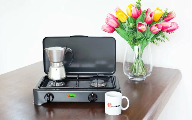 cocina de 2 llamas de gas, quemador de aleación Pyral N2, tapa del quemador esmaltada, soporte de olla de acero plano esmaltado. Gran diseño gracias a su especial color gris oscuro