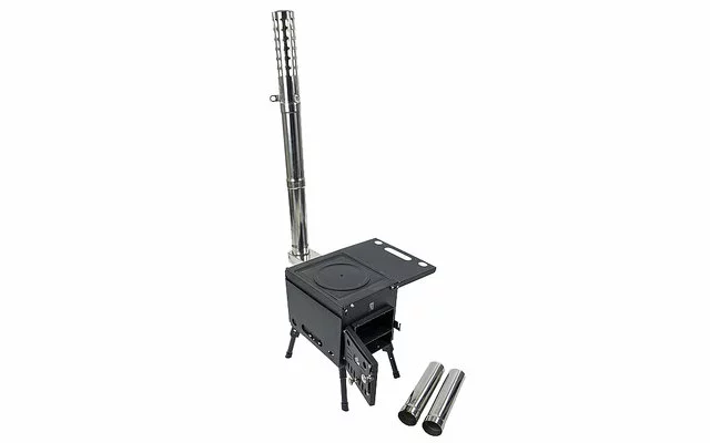 La estufa puede utilizarse bajo un toldo con la chimenea en el exterior. Esto proporciona un buen calor bajo un toldo. La cocina también está equipada con una placa de cocción. Esto significa que el agua o los alimentos también pueden hervirse en la estufa. El material de la estufa es el acero.