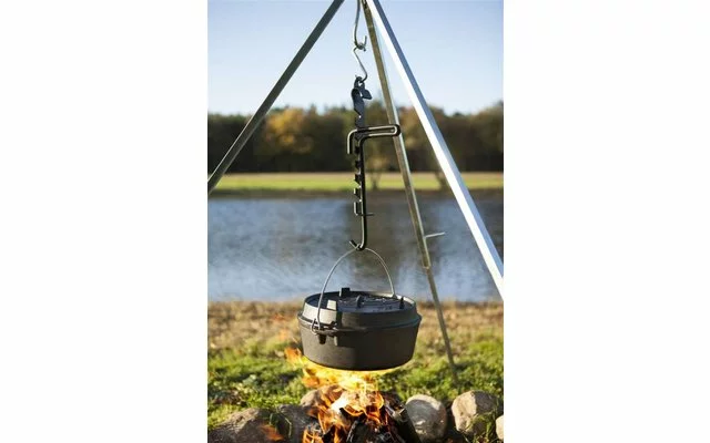 El gancho para hervidor de Petromax, fabricado en acero revestido, traslada el principio del gancho, transmitido desde la Edad Media, a la cocina moderna de exterior. Puede colgar en el sólido soporte incluso las teteras y ollas más pesadas sobre la hoguera. Con los siete dientes de la sierra de caldera, podrá literalmente «subir de nivel» cuando cocine al aire libre. Permite variar cómodamente la distancia entre la olla o la tetera y el fuego y, por tanto, la temperatura de cocción de los alimentos. Gracias a la práctica suspensión -una combinación de ojal y codo- puede fijar el gancho para hervidor a su trípode, así como al travesaño de su zona de cocción por encima del fuego. La guía inferior del aparato impide que la sierra se suelte durante el uso, lo que garantiza la seguridad de la cocina al aire libre.