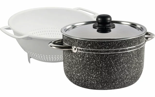 Práctico juego de ollas para pasta de 3 piezas con un moderno aspecto de granito. Olla de aluminio de alta calidad con revestimiento antiadherente en el interior y tapa de aluminio. Incluye un colador para la pasta o las verduras. Compacto, fácil de limpiar y extremadamente ligero