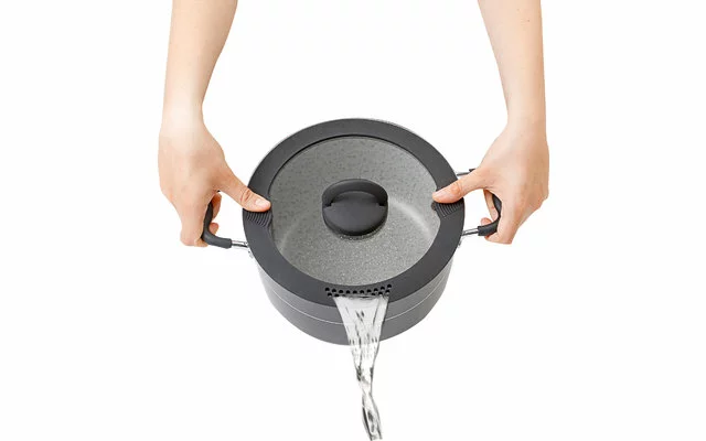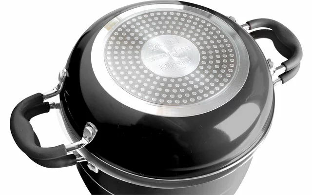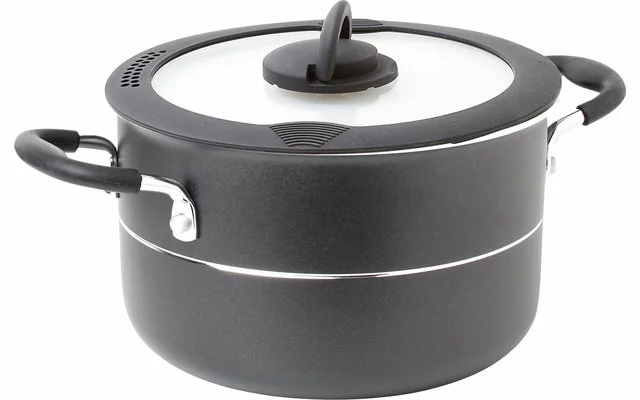 juego de ollas de aluminio de 9 piezas con la nueva tecnología VACUBLOCK y revestimiento antiadherente de alta calidad en el moderno diseño Stone Rock. Incluye una práctica tapa de cristal universal con borde de silicona escalonado y orificio para el vapor para compensar la presión – se adapta a ollas y sartenes con tres diámetros diferentes. La segunda tapa de cristal con borde de silicona que reduce el ruido está perfeccionada con agujeros de goteo integrados para facilitar el vertido y una ranura para colocar fácilmente las pinzas de mango. Las dos tapas de cristal están equipadas con asas plegables que ahorran espacio
