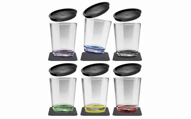 Los vasos de plástico, nobles y de gran calidad, albergan imanes perfectamente integrados en la base del vaso y están disponibles en las categorías de vino, champán, cerveza, trago largo y whisky.