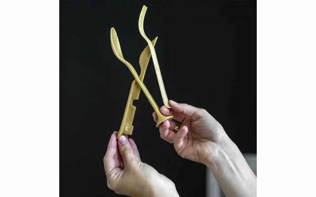 Para abrirlo, basta con pulsar el botón y todas las piezas se separan entre sà muy fácilmente. Los cubiertos se adaptan cómodamente a la mano y son muy robustos. El cuchillo puede incluso manejar filetes. El material es especialmente duradero, insÃpido, apto para alimentos y apto para el lavavajillas.