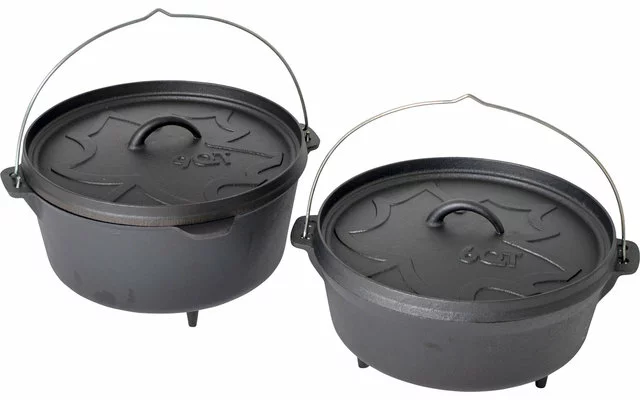 Una sartén de hierro fundido tradicional y multifuncional. Este horno holandés es excelente para preparar la comida sobre el fuego o las brasas. El hierro fundido macizo garantiza una distribución óptima del calor, por lo que la sartén puede utilizarse para hornear, freír, hervir o guisar sin problemas. La sartén tiene un revestimiento para evitar que se pegue y se oxide. También se puede utilizar como horno colocando briquetas de carbón encendido en la tapa. Hay 3 pies en la parte inferior para que la sartén pueda colocarse en el fuego de forma estable. Tiene un asa para colgar la sartén en un trípode.