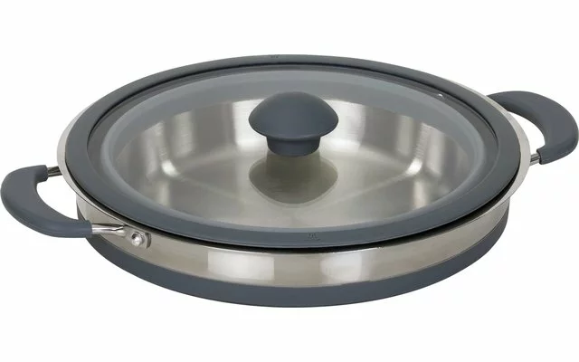 Inteligente mezcla de materiales de silicona y acero inoxidable. Así podrá cocinar su plato favorito incluso en la caravana. Apto para alimentos y para el lavavajillas. Altura plegada de sólo 6 cm con tapa.