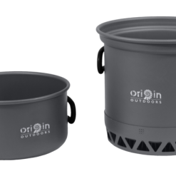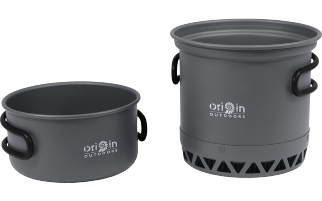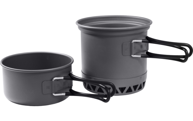 Este juego de ollas muy ligero de aluminio anodizado duro está equipado con un intercambiador de calor de gran eficacia. El intercambiador de calor ahorra tiempo al cocinar y reduce el consumo de combustible. Las robustas asas plegables proporcionan un agarre seguro mientras se cocina. Se guarda en poco espacio y se transporta en la práctica bolsa de malla.