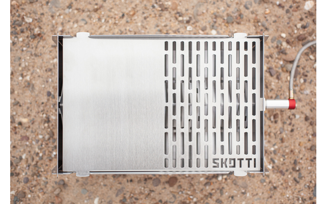 Plancha es español y significa plancha. Coloque la Plancha SKOTTI en su grill SKOTTI en lugar de la rejilla y, gracias al calor indirecto de la plancha, prepare alimentos maravillosamente tiernos y jugosos como gambas, verduras o setas. ¿O qué tal un huevo frito a la plancha? La Plancha SKOTTI cabe en la bolsa de su grill SKOTTI para transportarla.