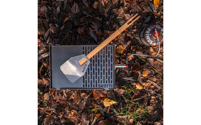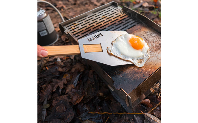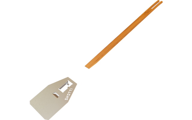 A partir de ahora, podrá girarlo y voltearlo como quiera: el nuevo SKOTTI FLIP es justo lo que necesitaba para la felicidad de su barbacoa. El volteador de alimentos de acero inoxidable es un pequeño pero fino complemento de las pinzas SKOTTI. Para ello, simplemente se enchufa una de las dos espátulas de madera de las pinzas junto con el FLIP – y ya tiene un práctico volteador para hamburguesas, huevos fritos o trozos de verdura y todo lo demás que no se puede agarrar bien con las pinzas.