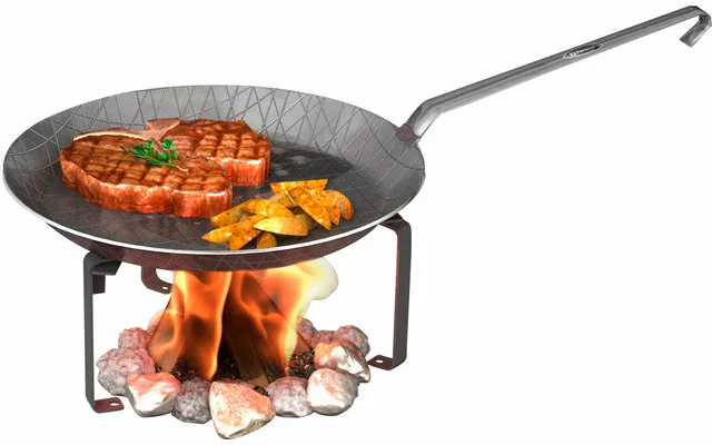 Gracias a los agujeros en cada pie, el gato de bandeja puede fijarse de forma segura al suelo con piquetas. Los montajes tambaleantes en la cocina al aire libre son cosa del pasado con el gato para sartenes Petromax