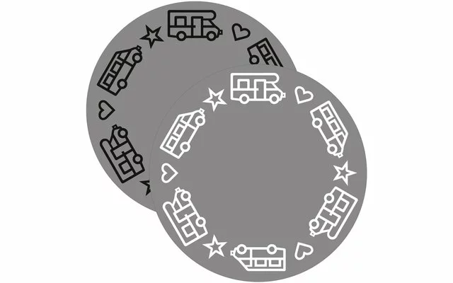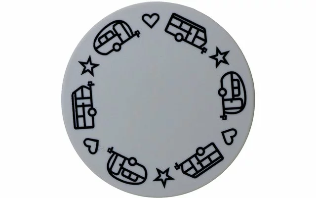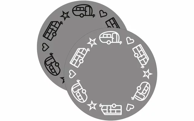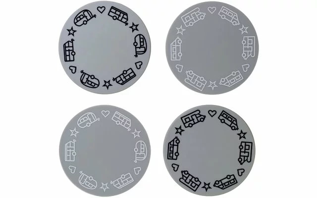 Posavasos de cristal Pufz en dos diseños diferentes (caravana/camper) con sÃmbolos impresos en dos colores, uno en blanco y otro en negro, ideales para las vacaciones de camping, en la carretera o en casa.