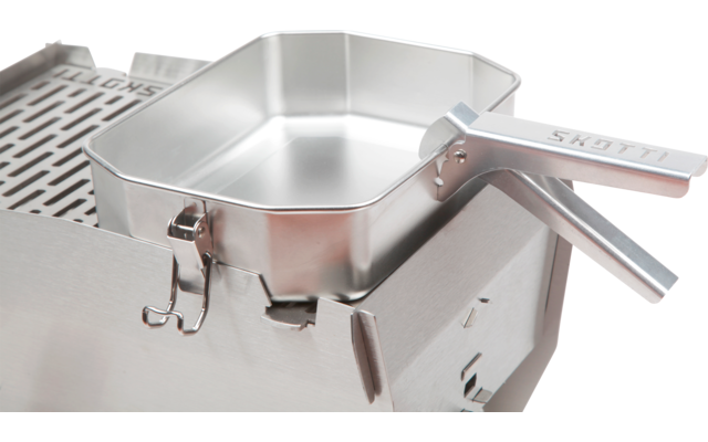 Transportar, cocinar, asar – con los Boks SKOTTI de acero inoxidable, ¡su barbacoa SKOTTI se convierte en una cocina de exterior para llevar! Cada BOKS viene con un mango de aluminio resistente con el que puede levantar la tapa y la lata de forma segura y utilizarlas como olla o sartén en la barbacoa SKOTTI. El fondo del BOKS ocupa exactamente la mitad de la rejilla de la parrilla SKOTTI, así que mientras se cuecen los fideos, burbujea la salsa de curry o se guisan las cebollas, puede seguir asando cómodamente al lado.