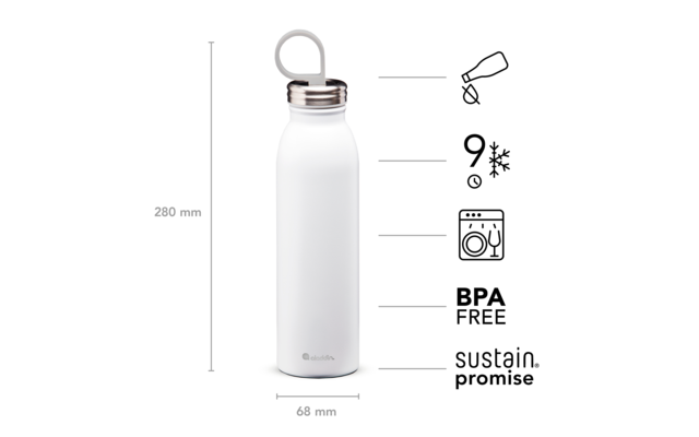 La nueva botella de agua de acero inoxidable Aladdin Chilled Thermavac es una botella de agua portátil y elegante que garantiza que el agua se mantenga fresca y bien fría durante muchas horas y realmente fría durante al menos 9 horas.