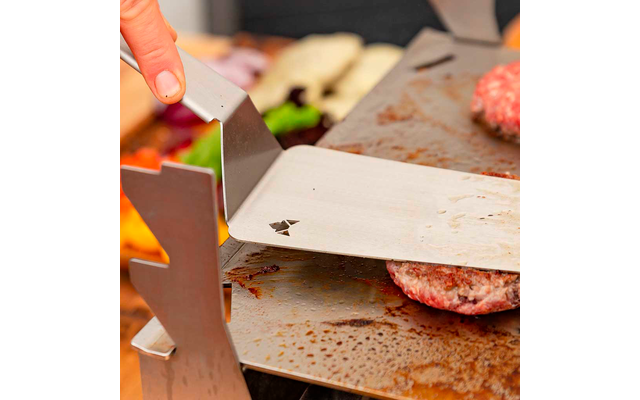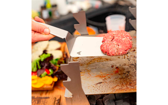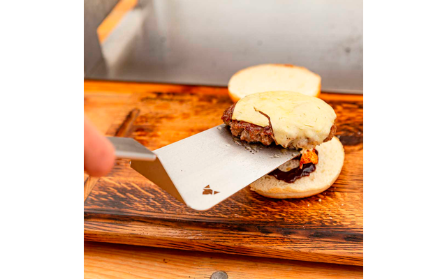 Perfecto para voltear las hamburguesas. Los huevos fritos y otros alimentos a la parrilla también se pueden levantar y girar rápida y fácilmente. También es ideal para preparar alimentos en una plancha.
